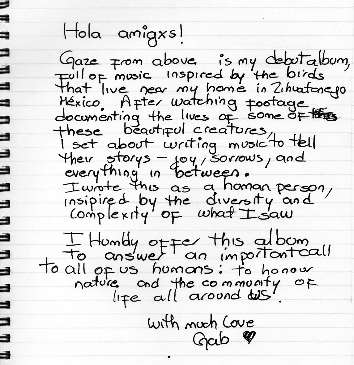 Hola amigxs! Gaze From Above is my debut album, full of music inspired by the birds that live near my home in Zihuatanejo México. After watching footage documenting the lives of some of these beautiful creatures, I set about writing music to tell their storys – joy, sorrows, and everything in between. I wrote this as a human person, inspired by the diversity and complexity of what I saw. I humbly offer this album to answer an important call to all of us humans: to honor nature and the community of life all around us. With much love, Gab ♥︎